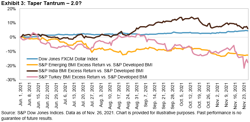 The U.S. and other large oil-consuming nations agreed to release emergency oil stocks during the month, a sign of the growing concern among policy makers of rising gasoline prices and the contribution of energy prices to escalating levels of inflation. The coordination came after the Biden administration failed to convince oil producers, including Saudi Arabia and Russia, to produce more oil to meet demand as the world recovers from the pandemic. China has yet to detail its reserve release. News of the release coupled with the emergence of the Omicron COVID-19 variant sent energy prices on a downward spiral over the closing days of the November. The S&P GSCI Petroleum fell 17.7%, while the S&P GSCI Natural Gas declined 17.3%.