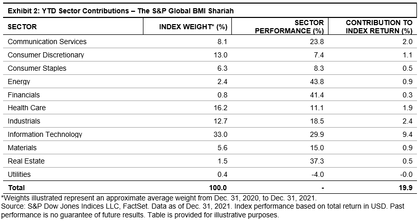 While global equities enjoyed broad gains throughout 2021, the greatest contributors of Shariah index performance were at the sector and country level (see Exhibits 2 and 3).