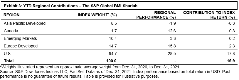 On a regional basis, high average weight toward the U.S. favored the S&P Global BMI Shariah during 2021, as the country enjoyed the best regional performance. The underperformance of the Asia Pacific developed and emerging markets regions limited overall gains, as Shariah-compliant stocks in Japan, South Korea, and China suffered during the period.