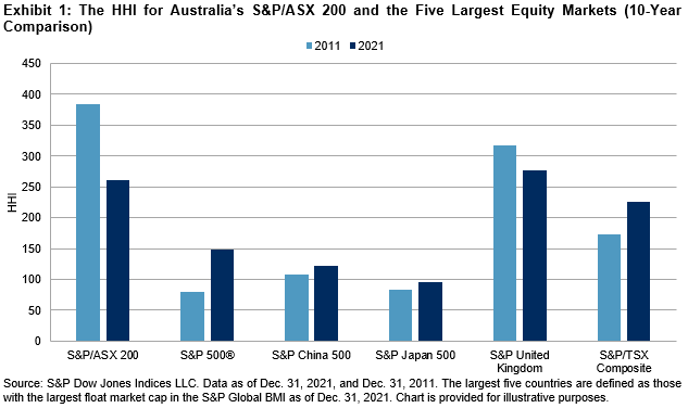 Exhibit 1 shows that market concentration declined significantly for the S&P/ASX 200 over the past decade, while it increased in benchmarks measuring four of the world’s five largest equity markets. The S&P 500 and Canada’s S&P/TSX Composite experienced the largest increases, while the U.K. was the only top five market to see a decrease.