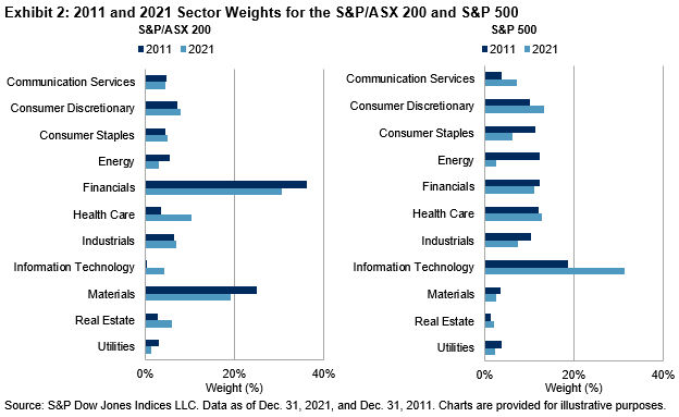 Examining the S&P/ASX 200 and S&P 500, we can see how the sector dynamic played out during this period. The weight of Materials and Financials declined for both indices, while Information Technology increased. However, the Information Technology sector had barely any participation in the S&P/ASX 200 10 years ago, which perhaps makes this change even more significant in Australia, given the small initial base.