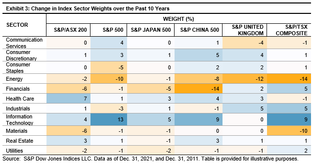 In Exhibit 3, we can see how much each sector’s weight has changed over the past 10 years. While some sectors declined across all markets, such as Energy and Materials, others like Information Technology have increased—this was most notable in the U.S., with its share in the S&P 500 going up by 13%.