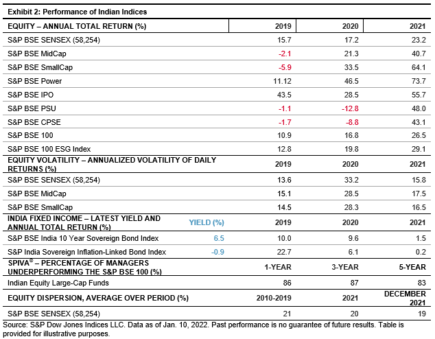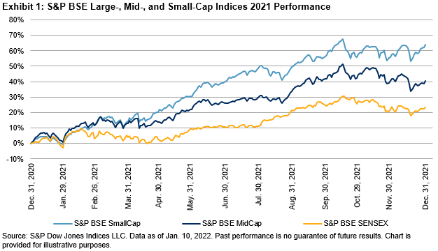 Despite the well-publicized setback for the Paytm IPO, the S&P BSE IPO surged 56% in 2021, the second-best-performing Indian equity strategy we regularly report on, lagging just 1% behind 2021’s winner, the S&P BSE Enhanced Value Index.