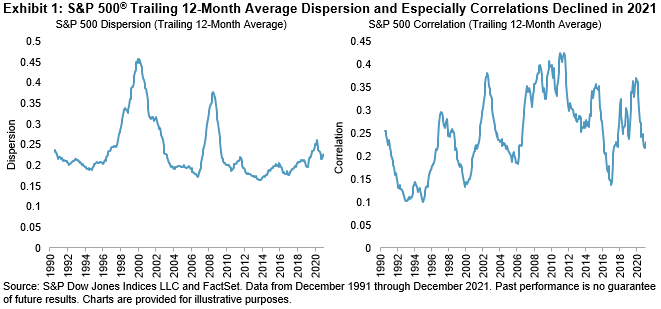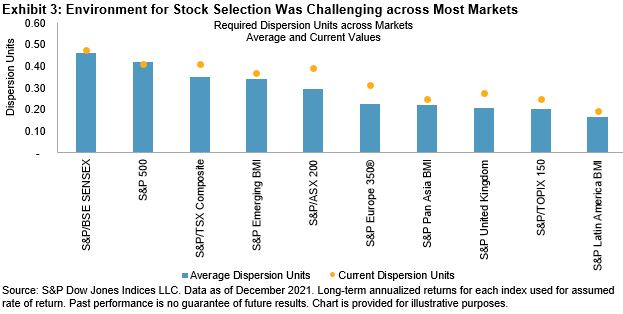 The challenging environment for stock selection is not unique to the U.S. 2021 stands in stark contrast to 2020, when both dispersion and correlations rose globally. Despite those relatively favorable conditions for stock selection, most active managers still underperformed, proving that true stock selection skill is rare. When SPIVA® results for 2021 become available, it would not be surprising if we saw dreary global active management performance once again.