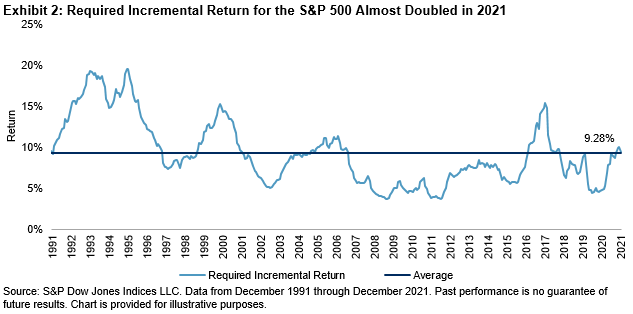 How much higher do returns have to be to justify the additional volatility active managers take on? By multiplying the cost of concentration by a rate of return consistent with the market’s historical performance (e.g., 10% for the S&P 500), we arrive at the required incremental return shown in Exhibit 2 for the S&P 500. Driven by the lower correlations seen in Exhibit 1, this measure almost doubled last year, indicating that active managers gave up a larger diversification benefit in 2021 than in 2020.