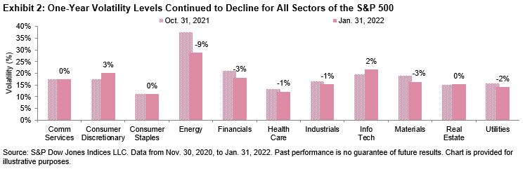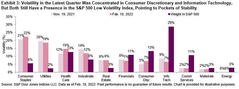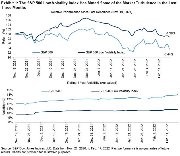 Since the last rebalance for the S&P 500® Low Volatility Index on Nov. 19, 2021, the market has experienced gyrations not seen since February 2021. The S&P 500 declined 6.44% since the November rebalance, with daily changes of greater than 1% almost half (44%) of the time. Low volatility strategies are designed to smooth out the path of the broader market at all times, but their work is most visible in times of stress, as shown in Exhibit 1. The S&P 500 Low Volatility Index is down just 1.28% as of Feb. 17, 2022.