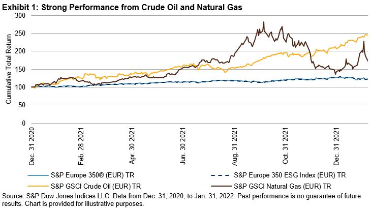 Commodities crushed it in 2021, with stretched supply chains a driving factor. The strong performance didn’t stop as we entered 2022. In this blog, we specifically look at crude oil and natural gas, which have outperformed the European equity market by some distance since the start of 2021 (see Exhibit 1), and what this can mean for European ESG strategies.