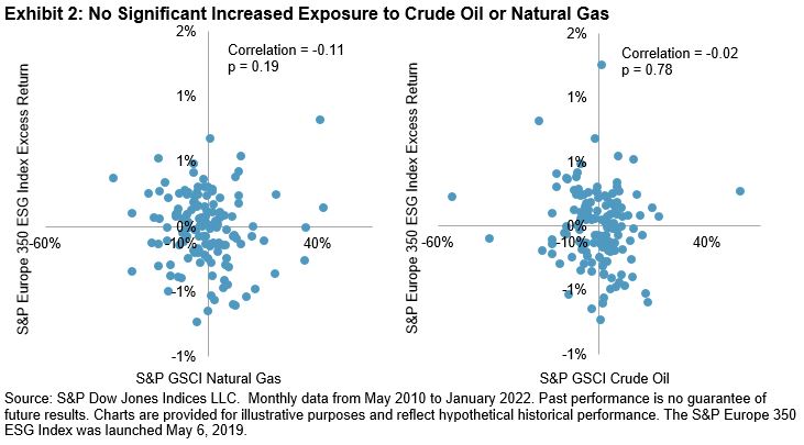 Given the environmentally unfriendly nature of these fossil fuel-based energy sources, it would make sense for an ESG strategy to have less exposure to energy companies. This expectation would assume an active sensitivity to both crude oil and natural gas, causing a drag on performance during times of rising oil and gas prices. Is this assumption true? Not necessarily. Since the index’s first value date, we observe no statistically significant correlation1 between the excess return of the S&P Europe 350 ESG Index (excess of its market cap-weighted benchmark) and either natural gas or crude oil (see Exhibit 2). Simply put, there has been no significant increase or decrease in exposure to natural gas or crude oil shown by the S&P Europe 350 ESG Index, relative to its market cap-weighted benchmark.