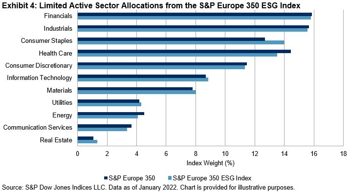 Why the lack of increased sensitivity? It’s all about index construction (see Exhibit 3). The S&P Europe 350 ESG Index targets sector neutrality (see Exhibit 4) by removing the companies with the lowest S&P DJI ESG Scores per GICS® industry group, after making exclusions based on undesirable ESG exposures. This means we are making exclusions on a relative basis within each industry group, rather than removing entire industry groups.