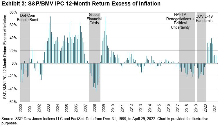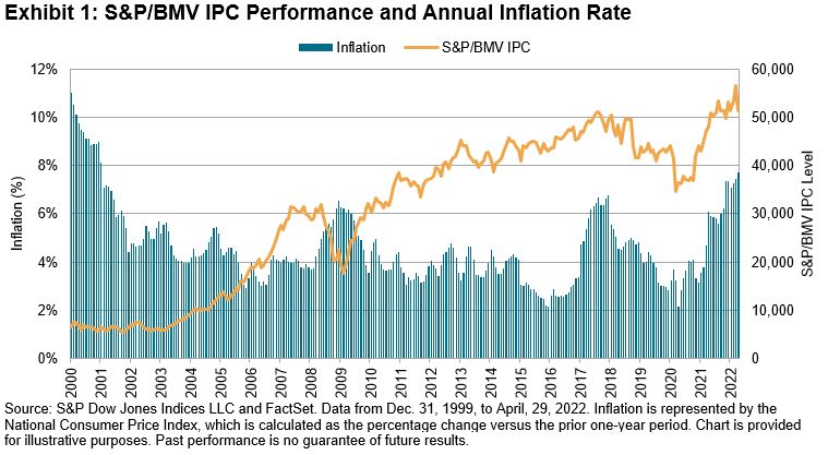 Inflation in Mexico has reached levels not seen in over 20 years, as the S&P/BMV IPC has receded from its all-time high reached earlier this year (see Exhibit 1). In this environment, market participants may question how inflation may affect index performance and the effectiveness of equity allocations as a hedge against it.