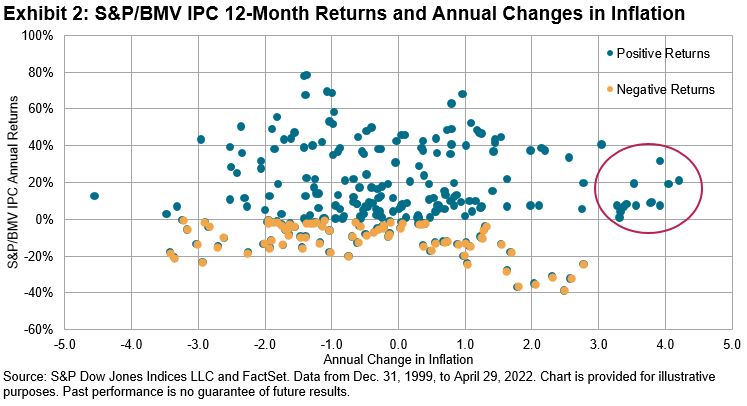 First, let’s analyze how the index has performed during periods of rising inflation. Exhibit 2 shows the rolling 12-month return of the S&P/BMV IPC compared with changes in inflation represented by the National Consumer Price Index (CPI) since 2000. For periods corresponding to rising inflation, the index returns were positive 75% of the time; however, during periods of sharp increases in inflation (over 3%), this figure increased to 100%, as shown by the returns in the circle. This shows that, historically, high inflation was associated with strong performance in the Mexican equity market.