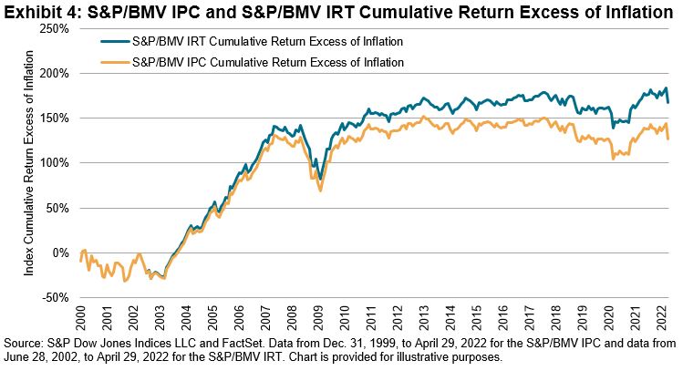 We can see in Exhibit 3 that, excluding periods of externally driven economic turmoil (the dot-com bubble, the Great Financial Crisis of 2008, the NAFTA renegotiation in the late 2010s and the COVID-19 pandemic), the market generally outperformed inflation by a significant amount. Since 2000, the index outperformed inflation in 60% of rolling 12-month periods. Including dividends being reinvested as measured by the S&P/BMV IRT, this grew to 68%. If we look at the past 10 years, the average outperformance was 9.4% on a price return basis and 10.4% including dividends. Analyzing the entire period in Exhibit 4, the S&P/BMV IPC provided a cumulative return of 127% over inflation and 168% with reinvested dividends, as represented by the S&P/BMV IRT.