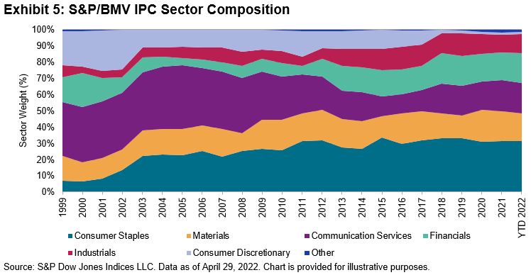 Lastly, this strong performance during rising inflation can be explained in part by the index’s composition. Consumer Staples and Materials, two sectors commonly considered to perform relatively well in inflationarity environments,1 make up nearly 50% on average of the S&P/BMV IPC over the past 10 years (see Exhibit 5). Therefore, their contribution to the index’s total return can be significant during these periods.