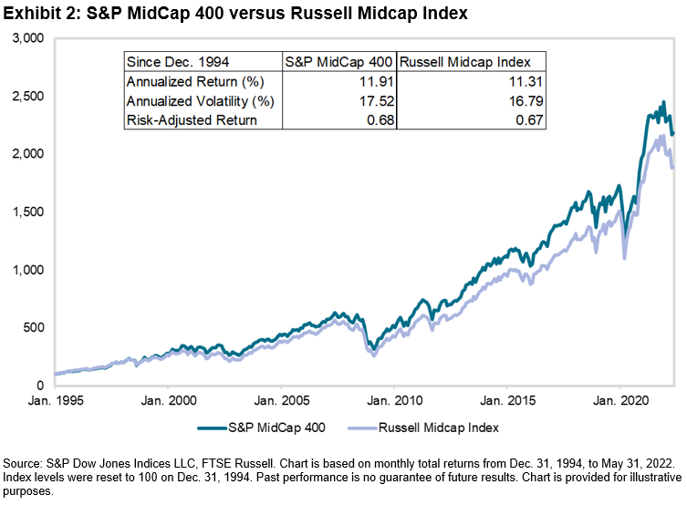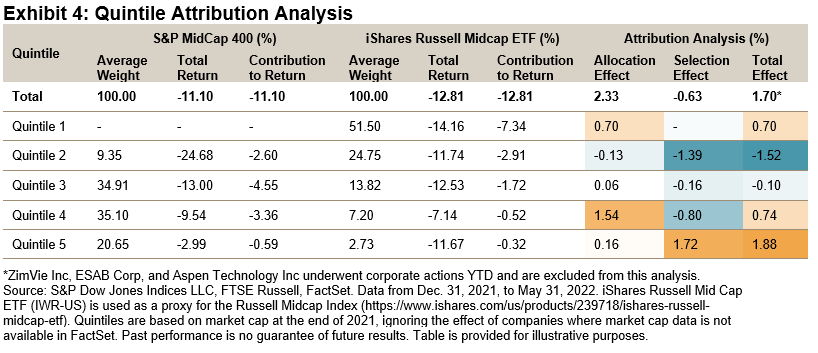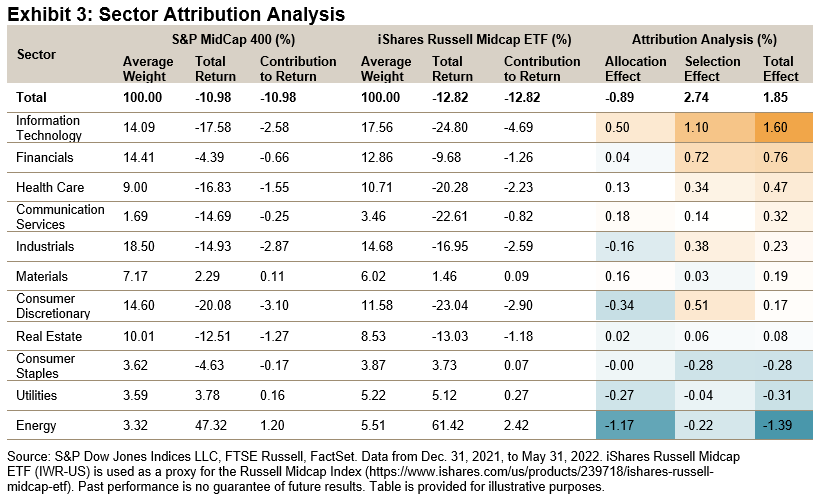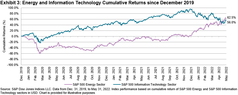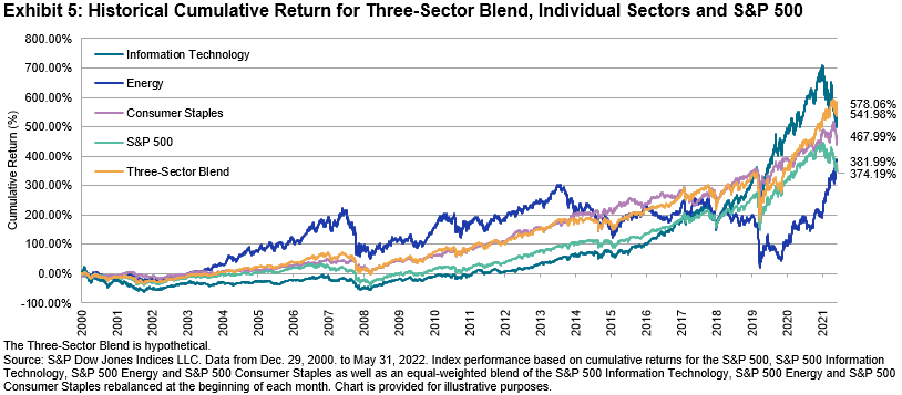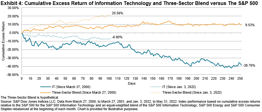 Historically, combining the Information Technology sector with less-correlated sectors has reduced risk and aided long-term performance. For illustration, we constructed an equal-weighted three-sector hypothetical blend of the S&P 500 Information Technology, S&P 500 Energy and S&P 500 Consumer Staples (rebalanced monthly) and compared it with the performance of the S&P 500 Information Technology alone during the first year of the 2000 dot-com crash as well as during the YTD 2022 downturn (see Exhibit 4).