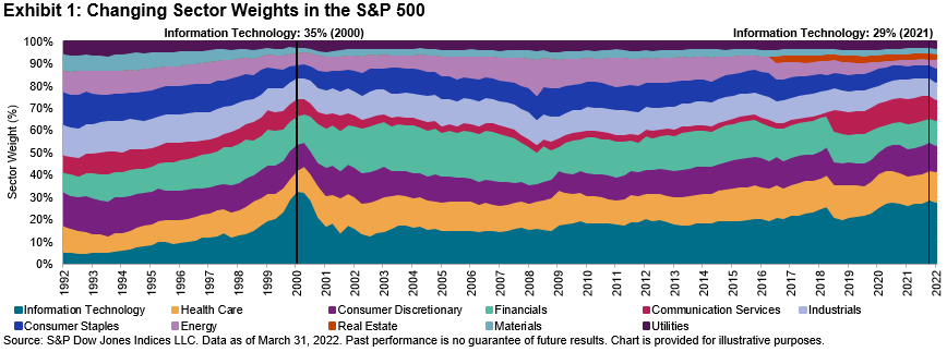 Do you remember sending your first email? For many, it was likely around the mid-1990s when a “googol” was still 10^100 rather than a verb and the @ key on your keyboard was seldom used. The world has changed indeed. In 1995, the Information Technology sector comprised just 10% of the S&P 500® but soon rocketed to 35% by March 2000 before a bursting bubble started its Icarian descent back below 20% (see Exhibit 1). By 2021, Information Technology reached a peak weight of 29% as the largest of the 11 S&P 500 sectors before leading the market downward this year.