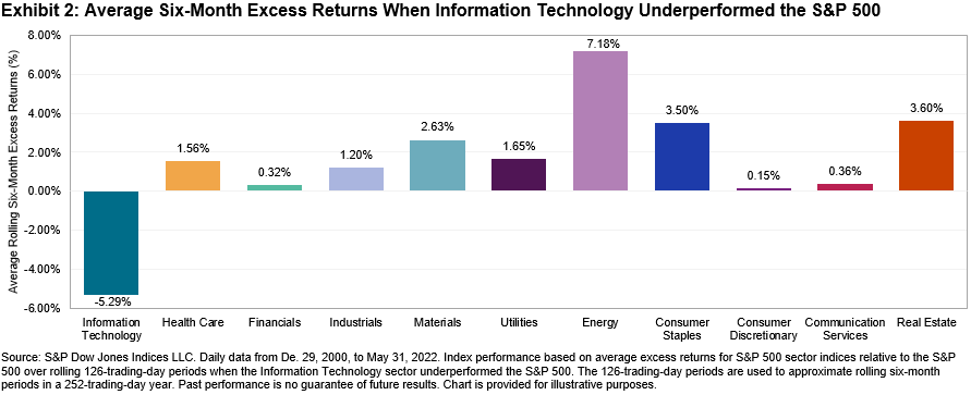 Because each S&P 500 sector uses the Global Industry Classification Standard® (GICS®) to group businesses that are similar, sectors tend to exhibit non-aligned periods of outperformance. On any given day since December 2000, 51% of sectors have outperformed over a trailing six-month period. We find that whenever Information Technology has underperformed the S&P 500 during a six-month period, all 10 other GICS sectors have, on average, outperformed the benchmark (see Exhibit 2).