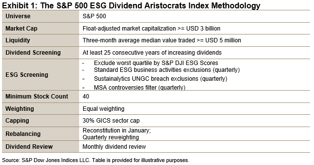 Exhibit 1 details the methodology of the S&P 500 ESG Dividend Aristocrats Index. The rules are consistent with the S&P 500 Dividend Aristocrats Index plus an ESG overlay. First, the index selects companies in the S&P 500 that have consistently increased dividends every year for at least 25 consecutive years. Next, multiple ESG screens are applied. The index excludes companies in the lowest quartile of S&P DJI ESG Scores.1 Additional ESG exclusion reviews are conducted quarterly based on business activities,2 United Nations Global Compact (UNGC) breaches3 and a Media and Stakeholder Analysis (MSA)4 controversy filter. Lastly, the remaining constituents are equally weighted and rebalanced quarterly.
