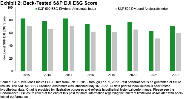 Turning to the index characteristics, Exhibit 2 shows that the S&P 500 ESG Dividend Aristocrats Index offered notable S&P DJI improvement over the S&P 500 Dividend Aristocrats Index. The S&P DJI ESG Score was improved, on average, by approximately 11.5 points per year, more than an 18% annual improvement.