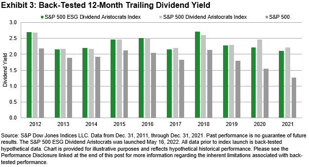 Looking at Exhibit 3, the S&P 500 ESG Dividend Aristocrats Index and the S&P 500 Dividend Aristocrats Index have had comparable yields, and both have held a significant yield advantage over the S&P 500. Over the full period examined, the average annual dividend yields for the S&P 500 ESG Dividend Aristocrats Index, S&P 500 Dividend Aristocrats Index and S&P 500 were 2.35%, 2.38% and 1.88%, respectively.
