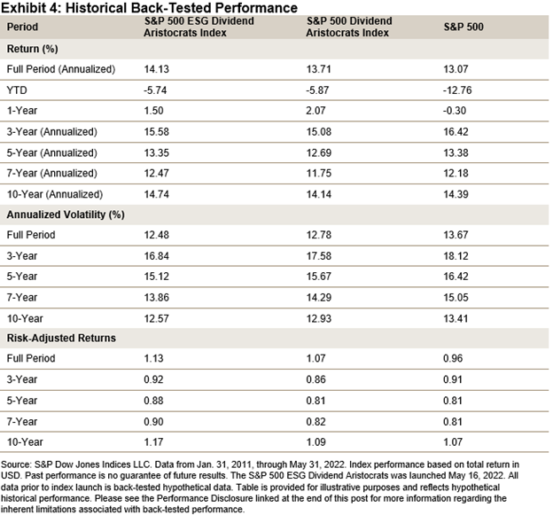 Exhibit 4 shows that the S&P 500 ESG Dividend Aristocrats Index has generated higher risk-adjusted returns over the 3, 5, 7, 10 and full year periods versus the S&P 500 Dividend Aristocrats Index and S&P 500.