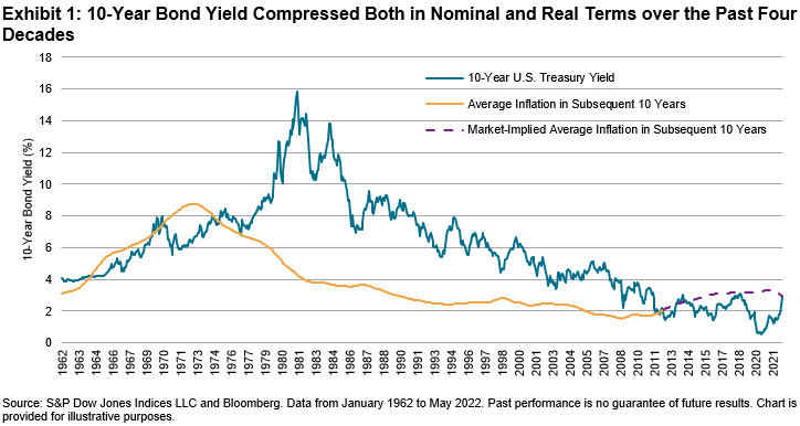 [1] Using U.S. inflation breakevens—calculated by subtracting the real yield of the inflation-linked maturity curve from the yield of the closest nominal Treasury maturity—as a proxy for inflation in the next 10 years. Source: S&P Dow Jones Indices LLC, Bloomberg as of May 31, 2022.