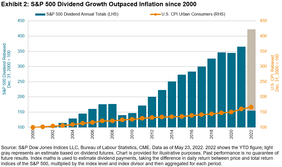 One alternative that has emerged as a potential source of regular and progressively increasing income is dividend-paying equities. Equity dividends have provided inflation protection over the medium to long term, with dividend growth surpassing the inflation rate historically. Taking a closer look at the S&P 500®, dividends paid out by index constituents rose from USD 140.1 billion in 2000 to USD 511.5 billion in 2021, corresponding to an increase by a factor of 3.7x and a compound annual growth rate of 6.4%. The rise in consumer prices, on the other hand, averaged just 2.3% over the same period. Exhibit 2 illustrates the significant spread between the dividend growth rate and the inflation rate over the past two decades, which translated to an increase of over 130% in the purchasing power of dividends paid out by S&P 500 constituents.