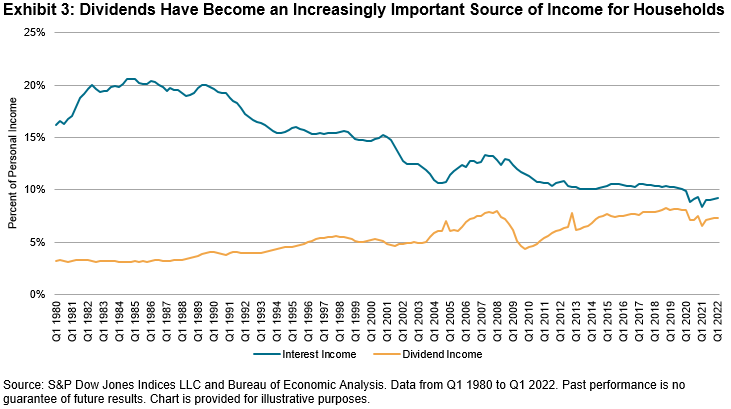 Given the significant shift in the relative importance of interest and dividend income, dividend-focused equity strategies may have an important role to play in income-focused investors’ portfolios. Dividend strategies, of course, come in many shapes and forms: S&P DJI’s range of dividend index offerings are designed to help investors achieve a variety of income goals by measuring the performance of strategies that seek to deliver high yield or stable payouts. Subsequent blogs in this series will take a closer look at some of S&P DJI’s dividend strategies available to the U.S. and international equity investors.