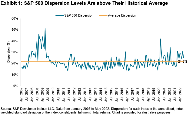 Both high dispersion and high correlations are now working in active managers’ favor. Higher dispersion means that the value of selection skill rises, while higher correlation implies a lower volatility hurdle to overcome. However, high potential for outperformance does not automatically translate into actual outperformance. There is an equally high potential for embarrassment for stock pickers without the requisite skill. When SPIVA® results for year-end 2022 become available next year, we will learn how many active managers were able to capitalize on this opportunity.