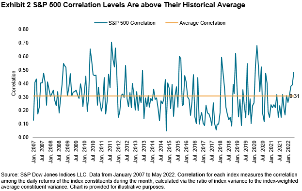 Exhibit 2 shows that as macro risks have risen, so too have correlations; in fact, the reading of 0.48 as of May 2022 is the highest since September 2020.