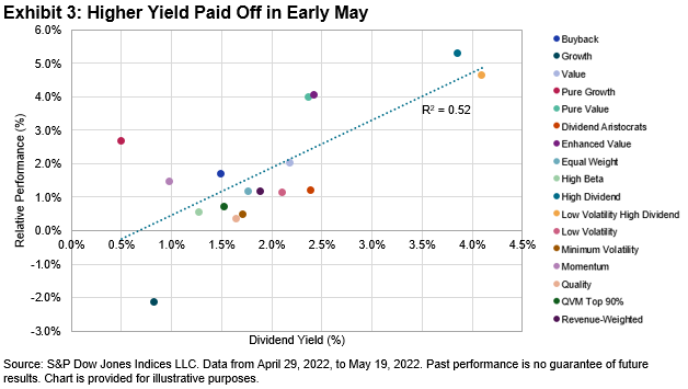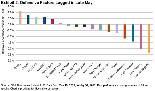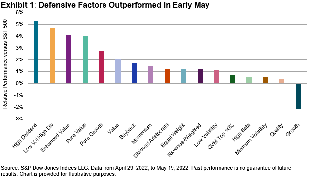 The performance of S&P 500®-based factor indices in May 2022 was generally favorable. Most factors outperformed the S&P 500, with the league table dominated by value and dividend tilts. The overall results for the month, however, obscure the intra-month dynamics: between the end of April and May 19, the S&P 500 fell by 5.5%, compounding the loss of 12.9% it had incurred in the first four months of the year. Despite briefly trading in bear market territory, in the last seven trading days of May, the index rallied 6.0% to finish the month with a small gain.