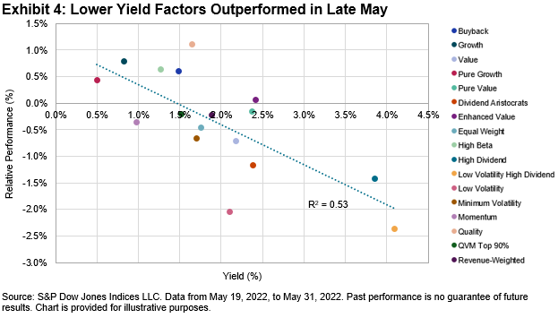 Exhibit 3 shows the relationship between each factor index’s beginning yield with its performance during the first 19 days of May. The relationship is strong, and upward-sloping; higher yield produced better relative performance.