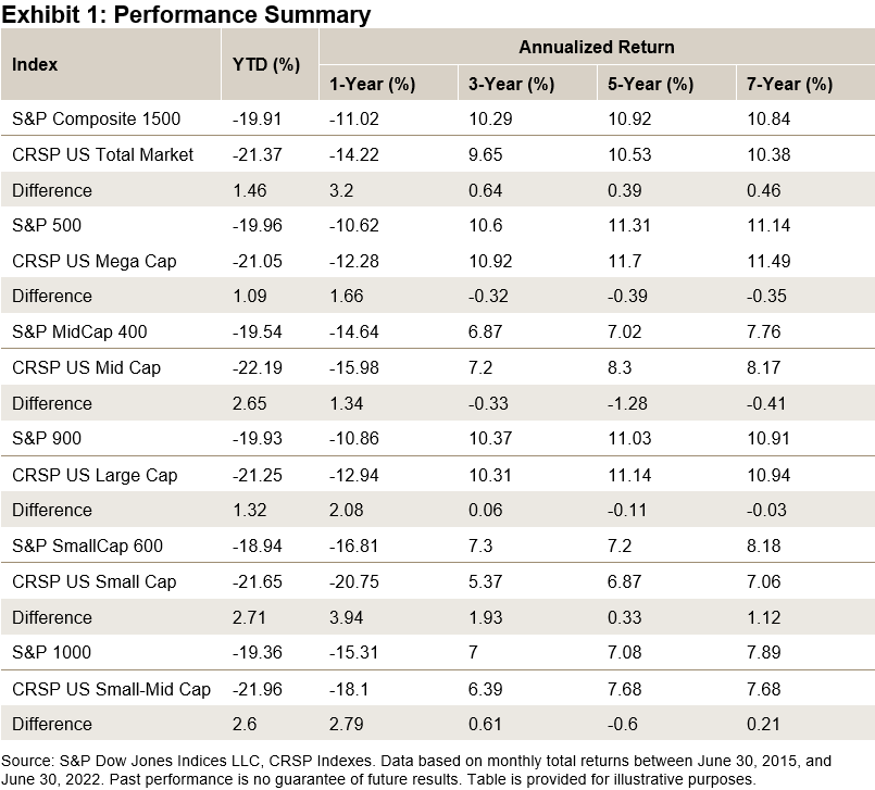 The first half of 2022 saw supply chain disruptions, interest rate hikes amid rising inflation and geopolitical tensions sour sentiment, creating a complex environment for equity markets. The S&P 500® was down 20%, which represented the worst start of the year since 1970. What was the impact on other S&P DJI U.S. equity indices and their competitors? In this blog, we analyze and compare the mid-year absolute and relative performance of various S&P DJI U.S. equity indices and CRSP equity indices designed to represent similar segments.
