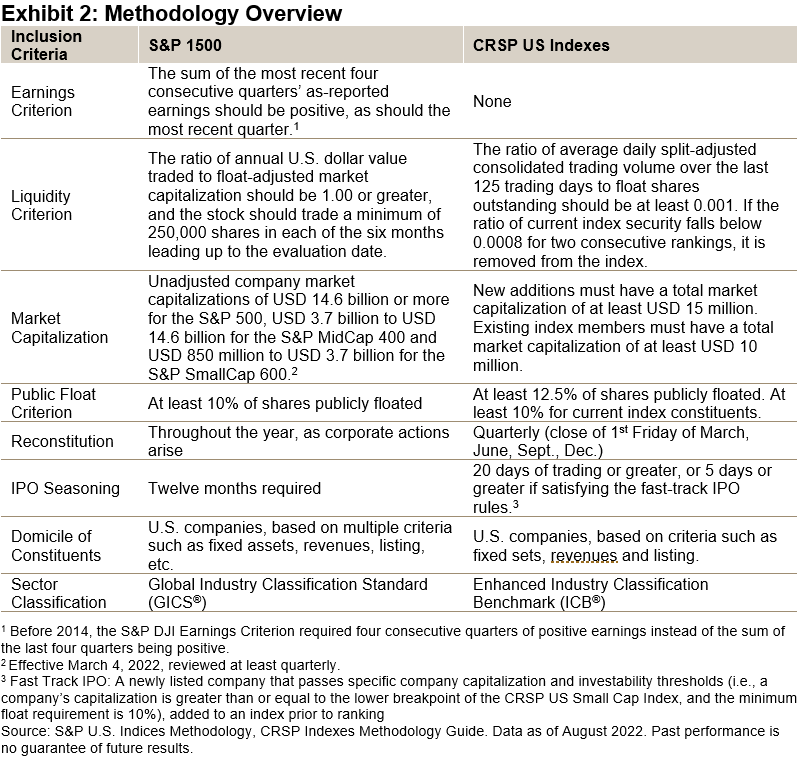 Differences in index construction can help us to understand these performance differentials. Exhibit 2 summarizes the methodologies underlying the S&P DJI U.S. equity indices and their CRSP counterparts. One of the biggest differences between the methodologies is that, unlike the CRSP indices, the S&P 1500 and its component indices use an earning screen: new index additions must have a history of positive earnings.