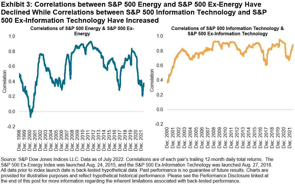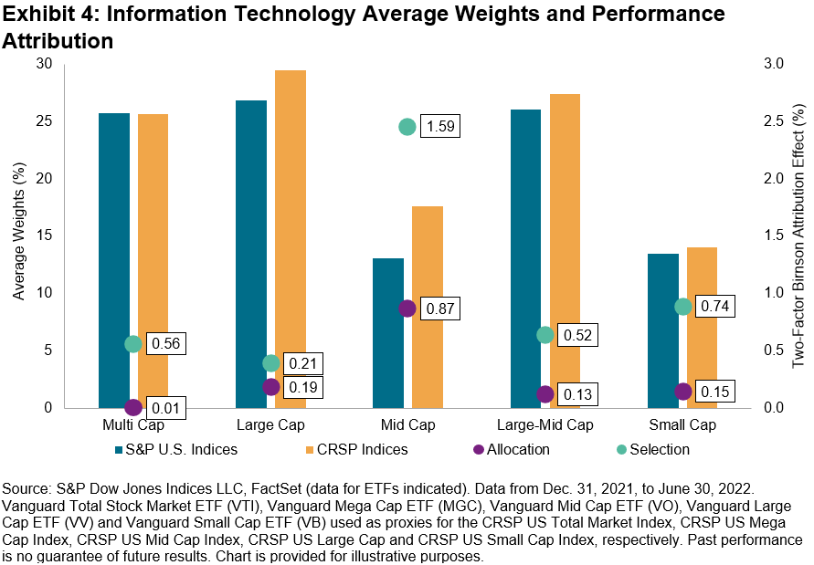 The methodology differences can also affect the indices’ sector exposures and the selection of companies within sectors. Exhibit 4 shows the 2022 average weight of each index to the IT sector as well as the allocation and selection effect specifically for the IT sector. The S&P U.S. Indices’ lower exposures to IT meant they were more insulated against the sector’s drawdowns in the first half of 2022. Interestingly, the S&P U.S. Indices’ choice of IT stocks proved more resilient than their CRSP counterparts and the selection effect was more important across the cap spectrum.