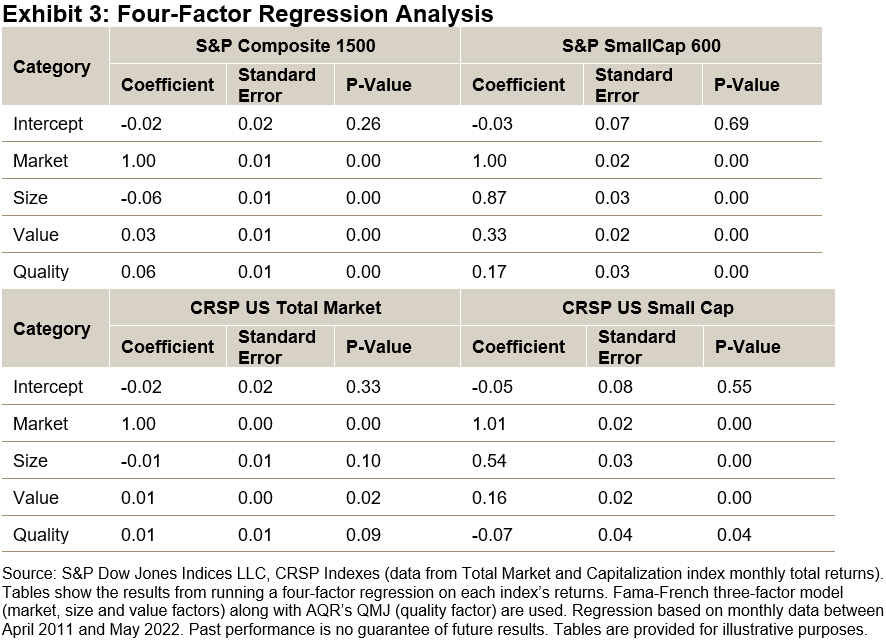 Exhibit 3 shows the impact of the earnings screen on the S&P Composite 1500’s and S&P SmallCap 600’s factor exposures: each S&P DJI U.S. equity index has statistically significant positive quality exposure. Similar results can be obtained for other market cap segments. Given the role of the quality factor in driving relative returns against other indices, particularly in small caps,1 differences in performance and factor exposures once again highlight the importance of index construction.