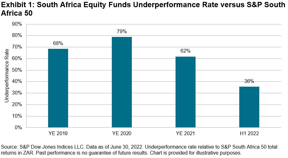 Overall, the underperformance rate of actively managed South Africa equity funds over H1 2022 was well below recent full-year measures (see Exhibit 1), with nearly two-thirds outperforming the S&P South Africa 50.