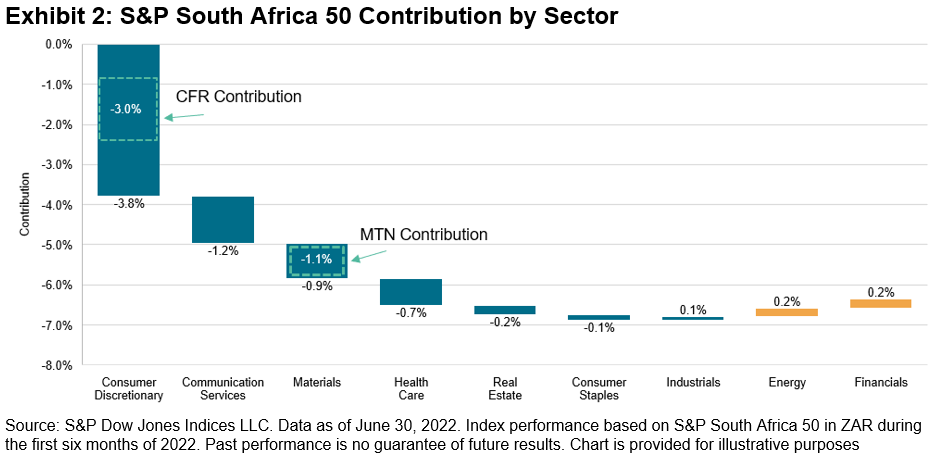 Avoiding a small number of underperforming stocks had the potential to make a big difference. Within the S&P South Africa 50, 49% of stocks trailed the benchmark and 51% outperformed, but just a few stocks contributed the majority of the index’s -6.3% H1 performance. Luxury goods firm Compagnie Financiere Richemont S.A (CFR) and communications company MTN Group Ltd. (MTN) combined to account for two-thirds of the total index decline. As the largest weight in the index, and the second-worst performer over H1, CFR made the most significant impact on the benchmark’s returns (see Exhibit 2).