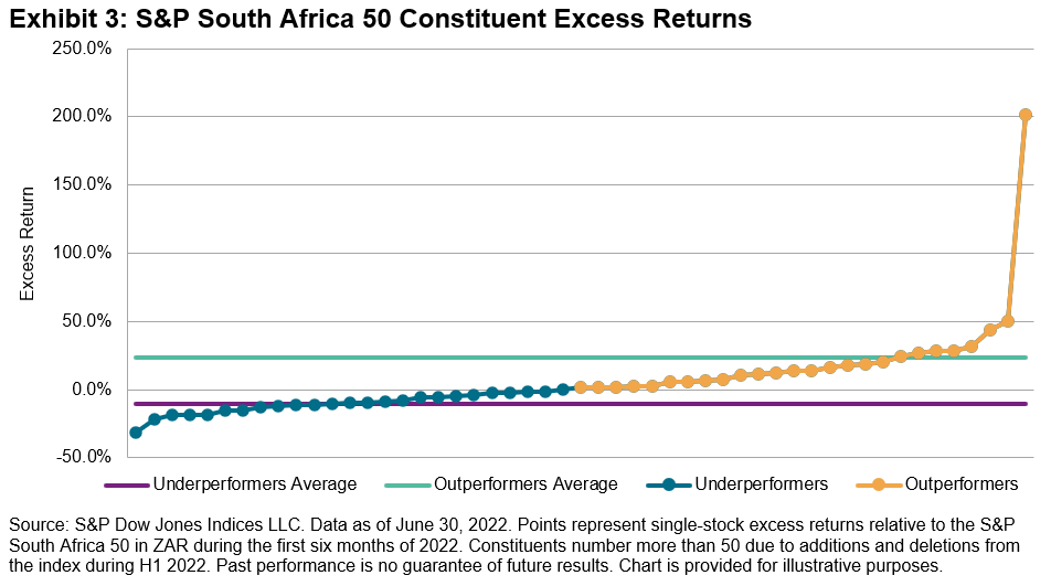Returns were not distributed “normally,” creating an interesting challenge for stock pickers. The median S&P South Africa 50 stock return was -5.1% in H1, close to the index return, but the (unweighted) average stock return was 0.3%, due to the strong outperformance from a minority of large winners. Indeed, the outperformers averaged 23% excess return, while underperformers returned -11% on average. Even when excluding an outlier with more than 200% excess return during H1 (and a weight in the index of less than 1%), the average excess return of remaining outperformers was 16%. In other words: a manager’s chances of picking an underperforming or outperforming stock were nearly equal, but outperforming stocks were disproportionately rewarding to performance.
