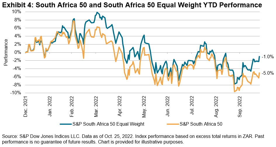 Based on the relative performance of the S&P South Africa 50 Equal Weight Index, tilting away from mega-cap names may have been one way for active managers to navigate a successful H1. The equal-weighted index outperformed the cap-weighted S&P South Africa 50 by 1.5% through H1, and in a perhaps positive sign for the full-year results, has continued to separate itself by an even wider margin since then (see Exhibit 4).