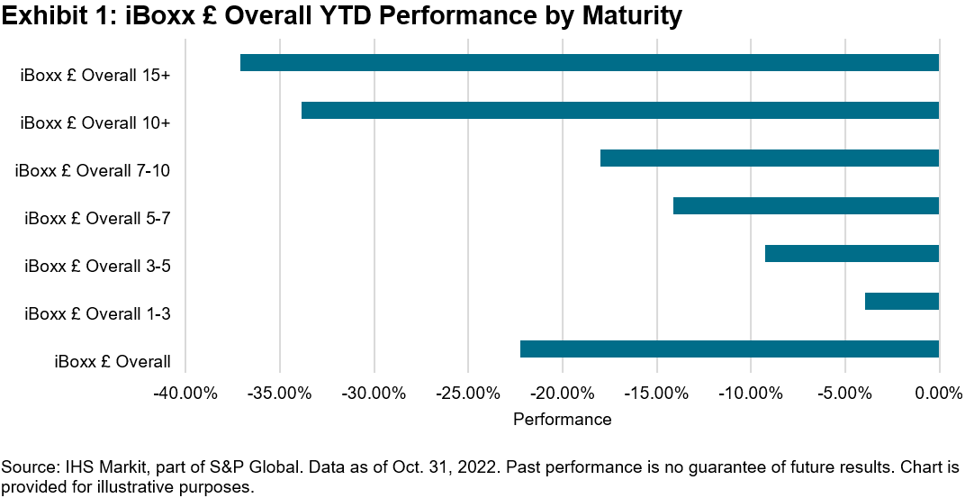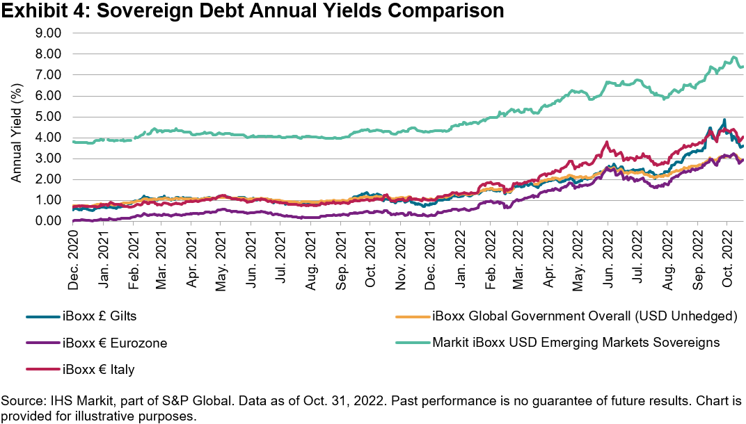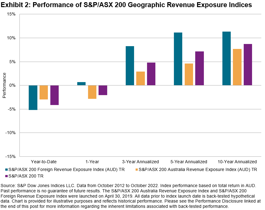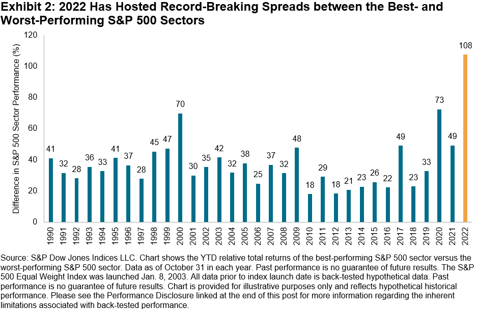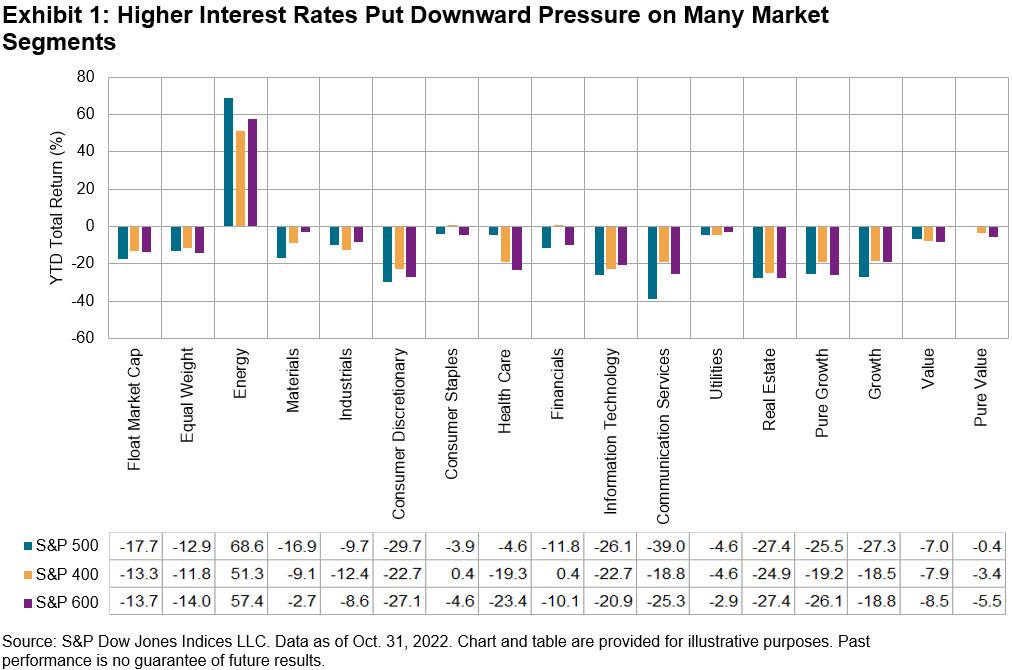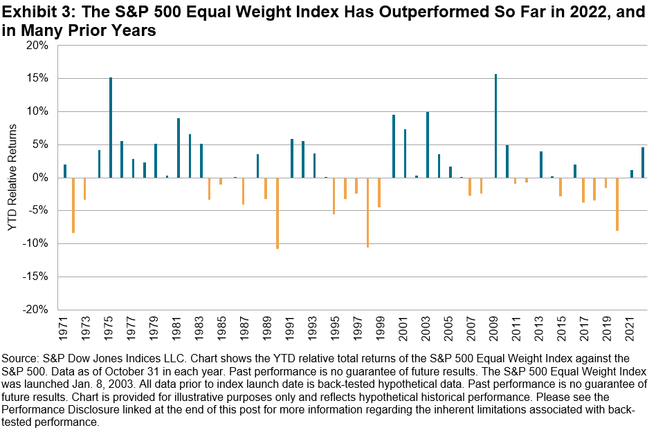 In this tumultuous market characterized by Fed rate hikes, elevated inflation and a strong dollar, mega-cap growth companies have suffered heavy losses, paced by recent “Big Tech” earnings disappointments from Meta, Microsoft, Alphabet, Amazon and others. The S&P 500® Top 50 declined by 19% over the past 12 months, underperforming the S&P 500 by 5%. The unsurprising result is that S&P 500 Equal Weight Index, which by definition is underweight these mega-cap names, has outperformed. Exhibit 1 shows that the equal weight index beat the S&P 500 by 5% in the 12-month period ending October 2022.