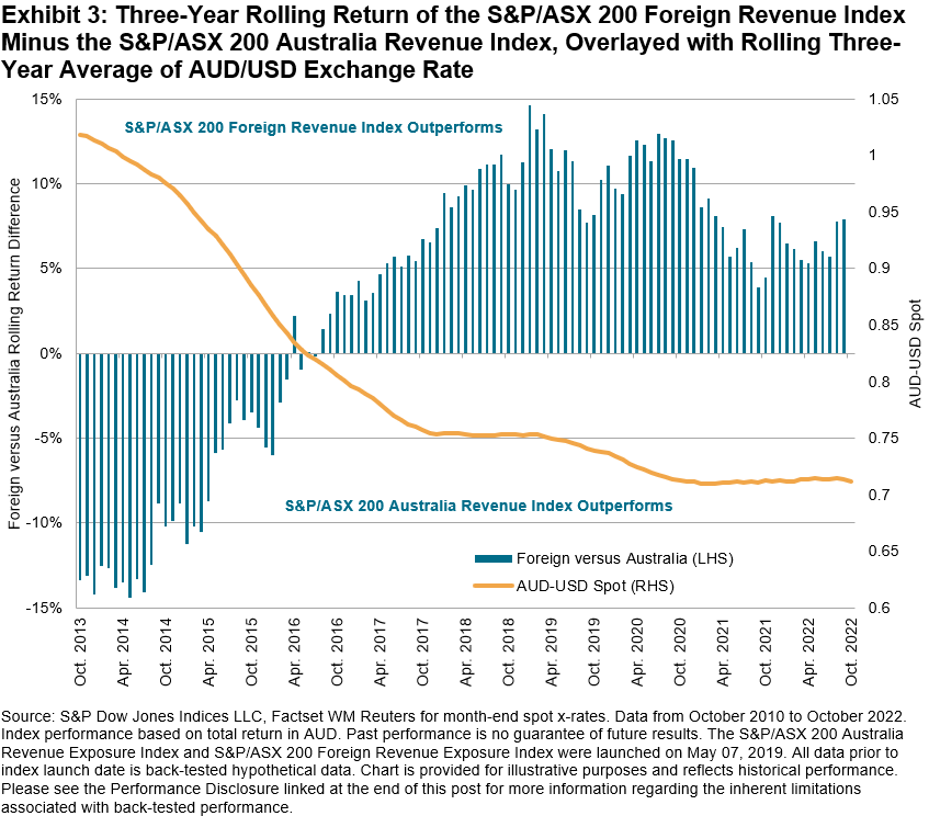 In addition to favorable sector exposures, the importance of which my colleague discusses here, the S&P 500 Equal Weight Index’s inherent factor tilts have proven beneficial as well. The strategy’s small-cap bias has been a tailwind, since smaller-cap companies, whose revenues are more domestically generated, have been less vulnerable to the macro headwind of a stronger U.S. dollar. Exhibit 3 illustrates the recent strong outperformance of the S&P 400® and the S&P 600® relative to their large-cap counterpart.