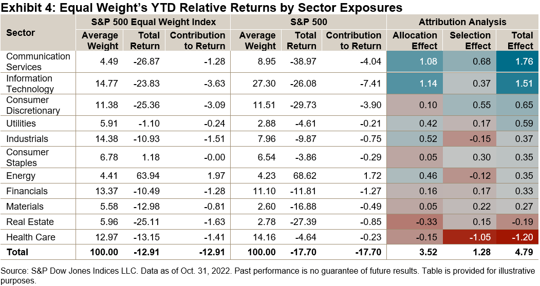 Exhibit 2 shows that the S&P 500 Equal Weight Index’s underweight to Communication Services and Information Technology, sectors that posted substantial losses so far this year, was a key contributor to the index’s recovery.
