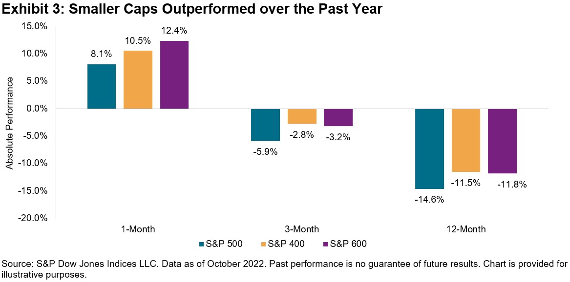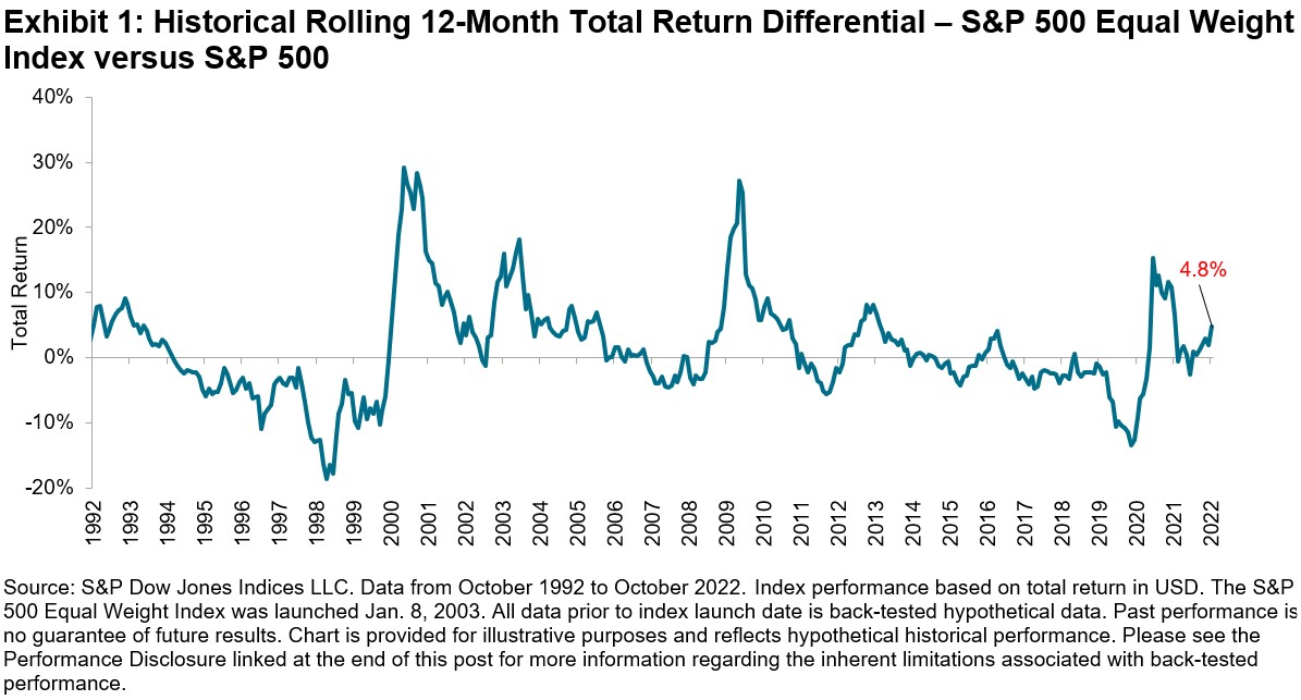 In this tumultuous market characterized by Fed rate hikes, elevated inflation and a strong dollar, mega-cap growth companies have suffered heavy losses, paced by recent “Big Tech” earnings disappointments from Meta, Microsoft, Alphabet, Amazon and others. The S&P 500® Top 50 declined by 19% over the past 12 months, underperforming the S&P 500 by 5%. The unsurprising result is that S&P 500 Equal Weight Index, which by definition is underweight these mega-cap names, has outperformed. Exhibit 1 shows that the equal weight index beat the S&P 500 by 5% in the 12-month period ending October 2022.