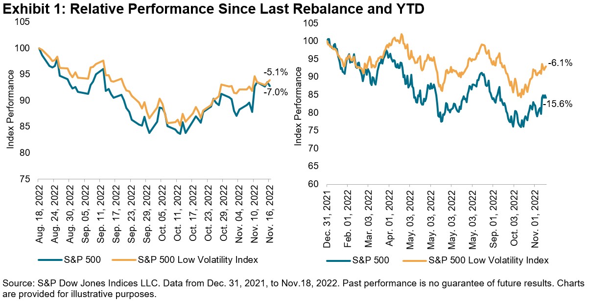 U.S. equities struggled again in the past three months. The last rebalance for the S&P 500® Low Volatility Index was in August 2022 and the S&P 500 has since declined 7.0%. The S&P 500 Low Volatility Index, which has historically moderated the performance of the benchmark, lost 5.1% in the same period.
