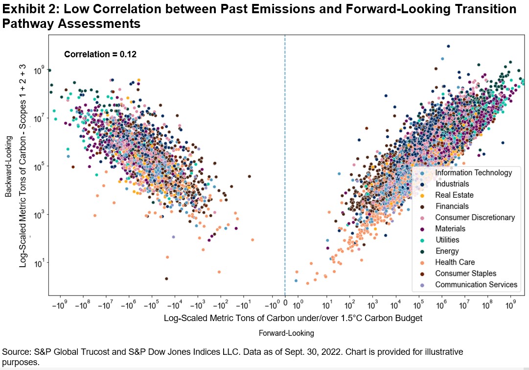S&P Global Trucost models temperature alignment by translating past emissions and forward-looking targets into a common and intuitive metric, which not only measures companies’ historical emissions at a given point in time, but also takes their (de)carbonization trajectory into account.2