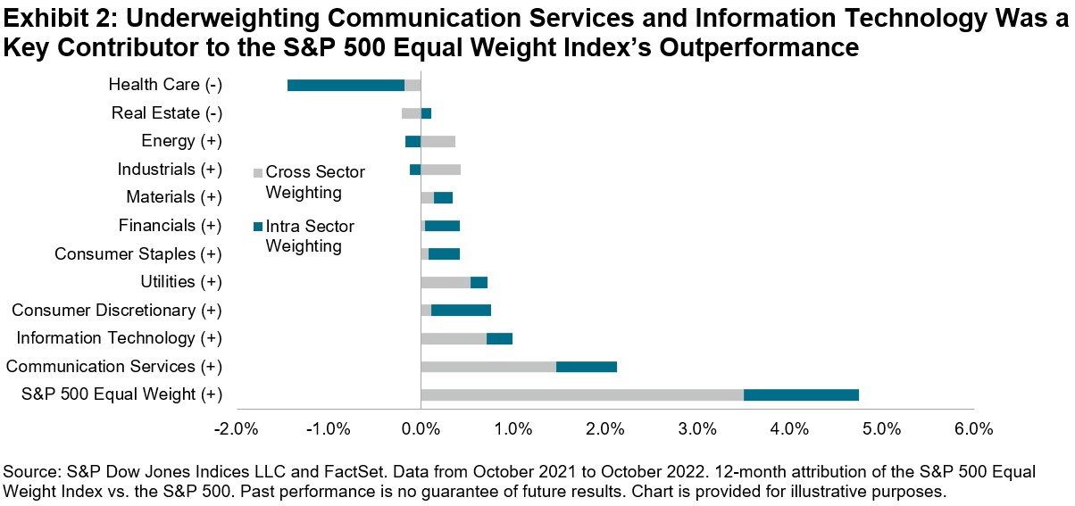 Exhibit 2 shows that the S&P 500 Equal Weight Index’s underweight to Communication Services and Information Technology, sectors that posted substantial losses so far this year, was a key contributor to the index’s recovery.
