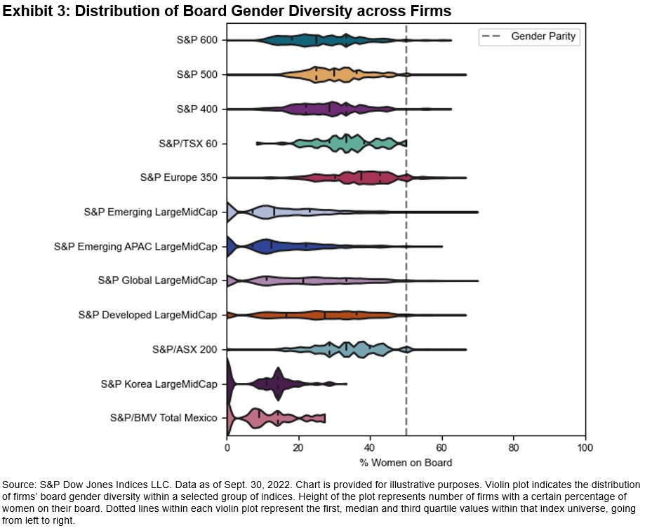 However, sector- and country-level metrics do not tell the full story, and the distribution within regional indices can vary dramatically. Exhibit 3 shows the range of values of board gender diversity across a selected set of investable universes.