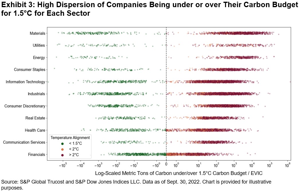 From a sectoral lens, there is a wide dispersion of companies under or above their carbon budgets (see Exhibit 3). While companies below their 1.5°C carbon budget are aligned with the Paris Agreement, as companies get further above (right of dashed line), they are likely to be aligned with higher temperature scenarios. As the increasing density of horizontal scatter points indicates, aligned companies accounted for only 25% of the universe as of Sept. 30, 2022.4