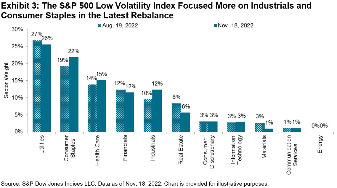 The latest rebalance, effective after the market close on Nov. 18, 2022, yielded just minor shifts in allocation. The two sectors that reduced their presence most significantly in the index were Real Estate and Materials, while the index focused more on Industrials and Consumer Staples. While Utilities also lost some ground, it remains the largest sector in the index. Energy stocks, which disappeared from the index in May 2020, have yet to make a reappearance.