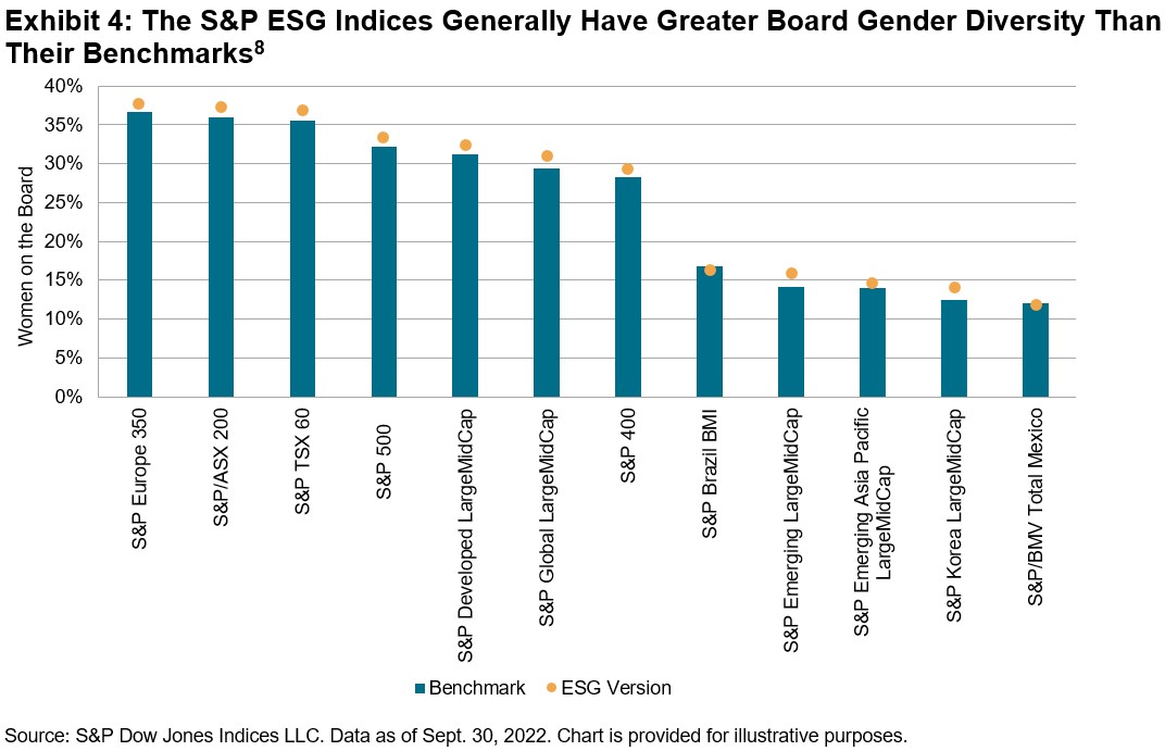 How could indices help those who are interested in companies with greater board gender diversity? Exhibit 4 illustrates the impact that the S&P DJI ESG Scores have within the S&P ESG Index Series to help improve the board gender diversity of constituents relative to the underlying index.